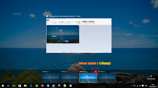 Jika kamu ingin menutup virtual desktop caranya dengan menekan kombinasi tombol keyboard Windows + Ctrl + F4 atau dengan memilih tombol x (silang) pada thumbnail virtual desktop.